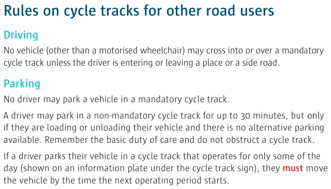 Page 195 of the Rules of the Road says that motorists are not allowed to drive or park on cycle tracks: