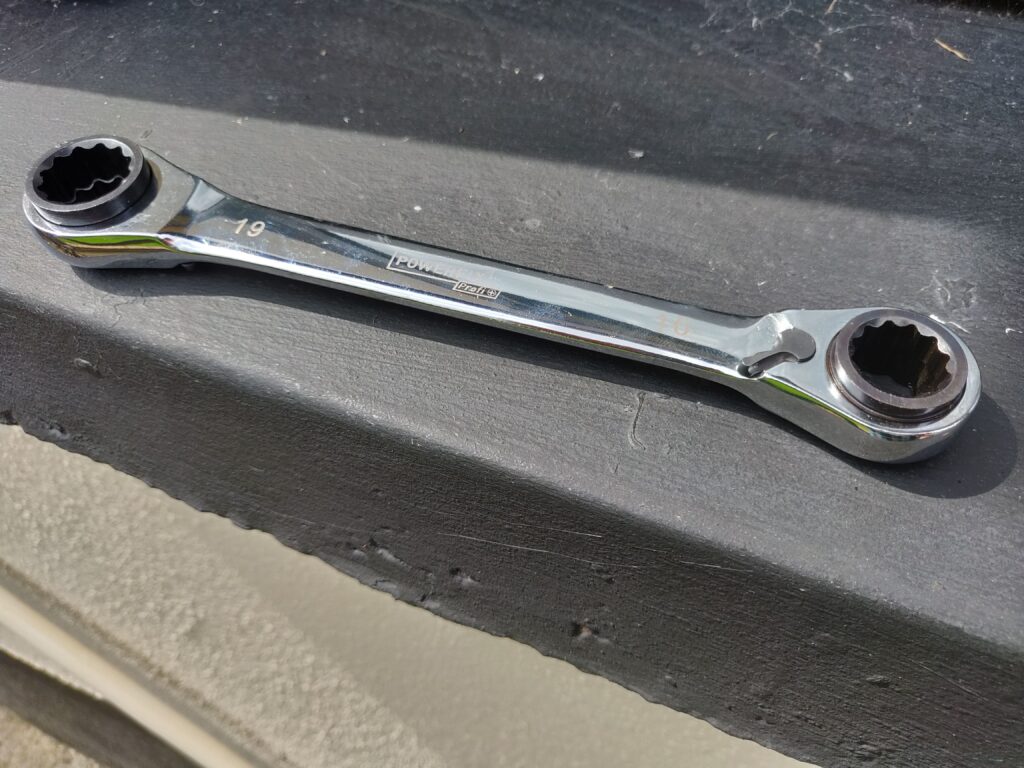Luckily, my local Lidl had some tools for sale when I was in today, and I got this ratchet spanner for about a fiver that has different heads to 16mm, 17mm, 18mm, and 19mm bolts. In the end I needed to use the 17mm head to get the bolt off!