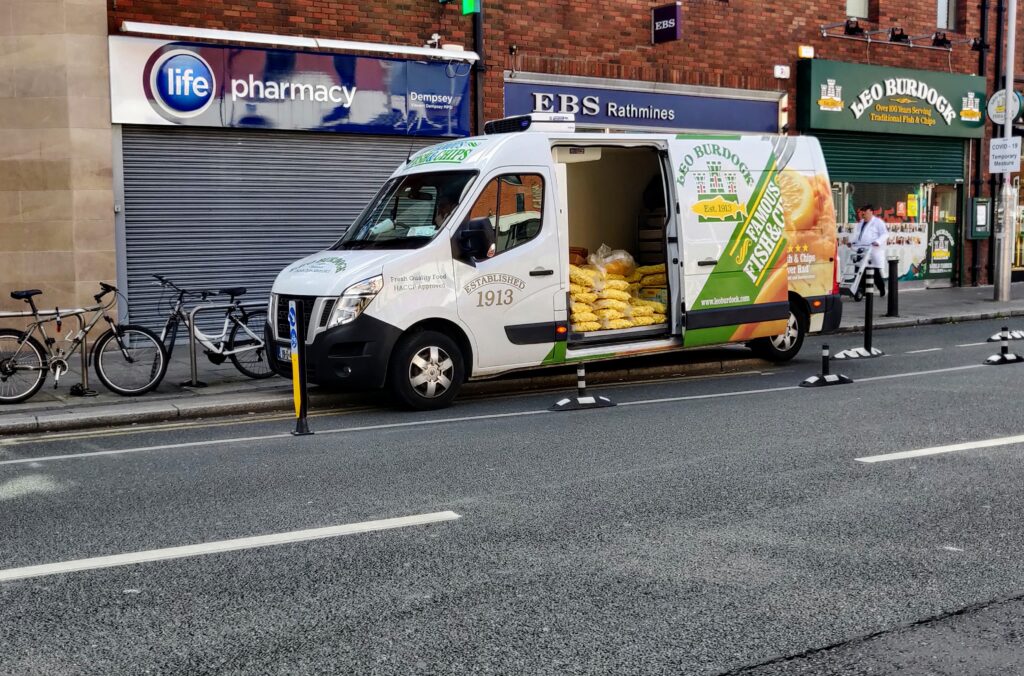 In this second photo, this employee of Leo Burdocks has parked blocking both the footpath and cycle lane, and on double yellow lines. There’s not enough room left inside the cycle lane, and so any passing cyclists have to ride on the outside of the bollards to get past.
