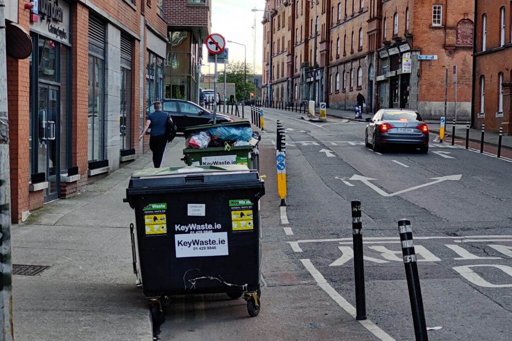 Before the cycle lane protection bollards were installed, it might have been trivial (if annoying) to swerve around these bins – but with the bollards in place, cyclist have to move outside of the bollards, placing them at greater conflict with other traffic.